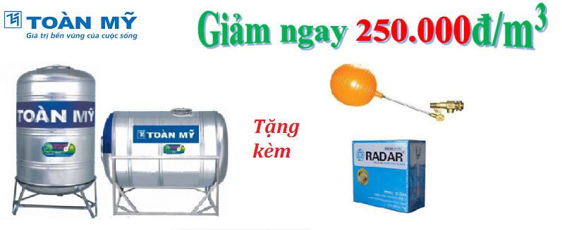 Khi mua tất cả các dung tích bồn nước inox Toàn Mỹ được giảm trực tiếp 250.000đ/m3, tặng kèm 01 bộ phao cơ (nếu gia đình Bạn đang sử dụng nước máy hay nước thủy cục), hoặc 01 bộ phao điện ( nếu gia đình Bạn sử dụng nước giếng).