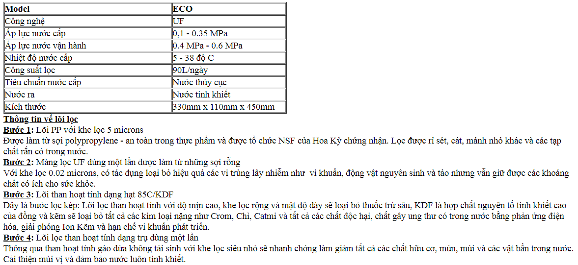 Máy lọc nước Toàn Mỹ Eco được sản xuất trên công nghệ hiện đại.Nước được lọc ra không chỉ tuyệt đối an toàn mà còn giữ lại được các khoáng chất cần thiết cho cơ thể. Khe lọc của màng thẩm thấu ngược nhỏ hơn đường kính sợi tóc tới 3.000 lần. Than hoạt tính làm bằng gáo dừa làm cho sản phẩm thân thiện với môi trường
